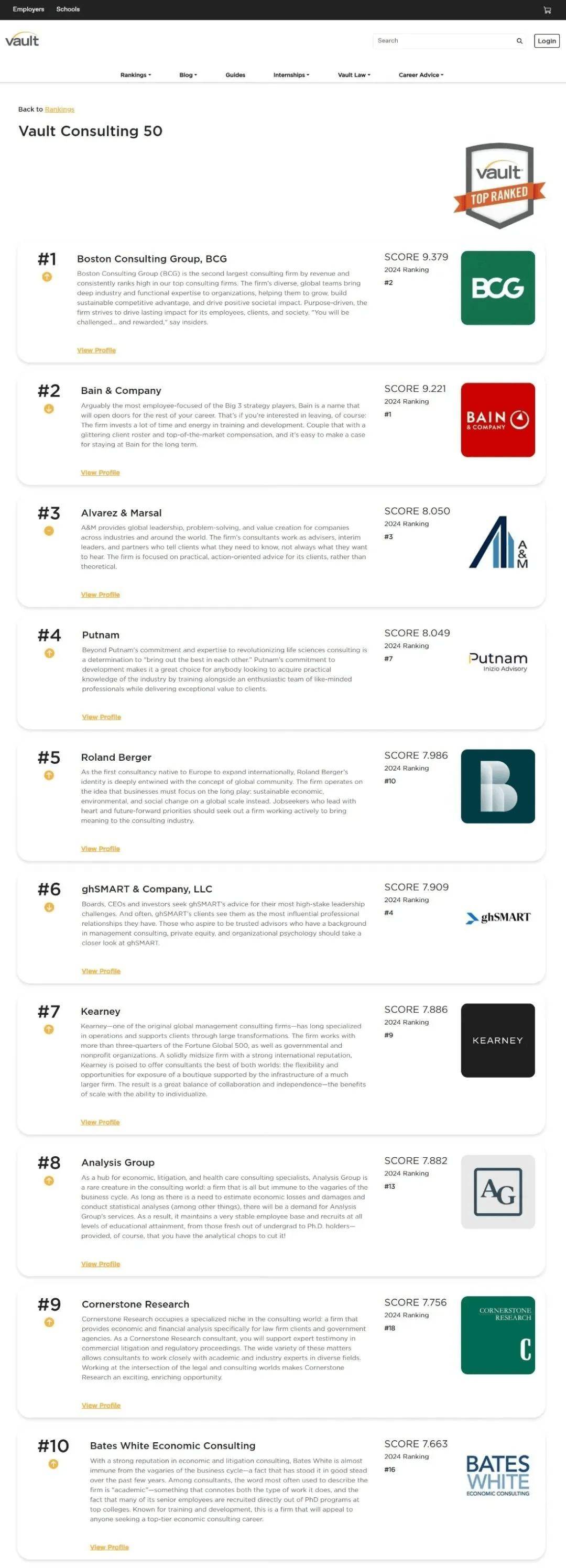 虽然每年Vault Consulting榜单都或多或少会有一些变化,但今年这份排名的变化之大简直可以说是颠覆咨询圈的程度: