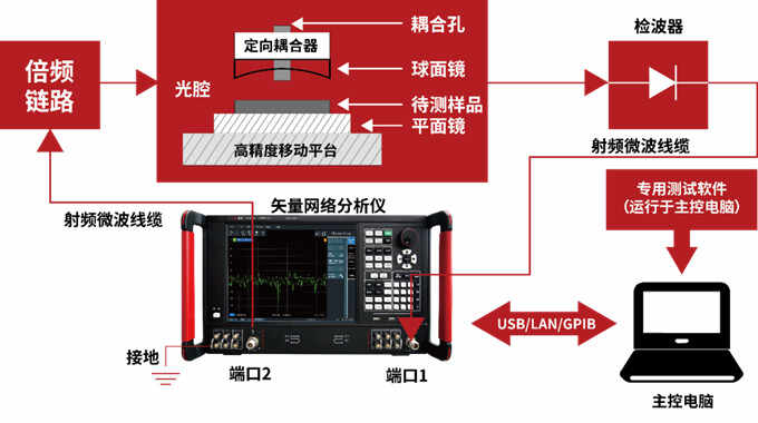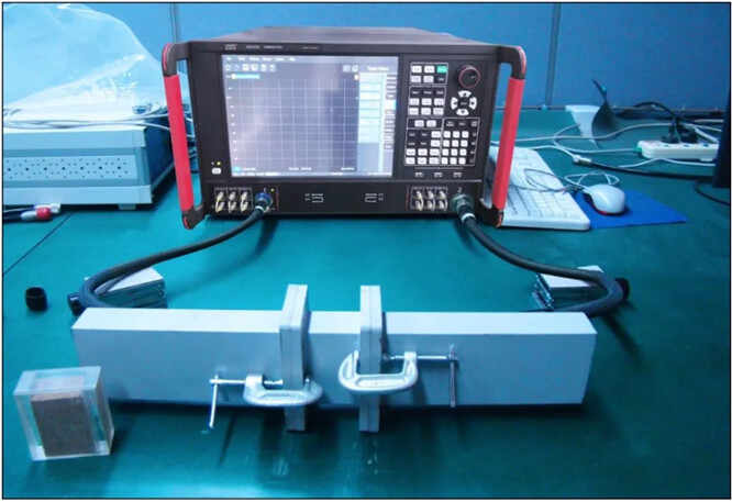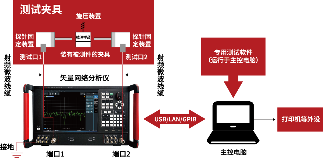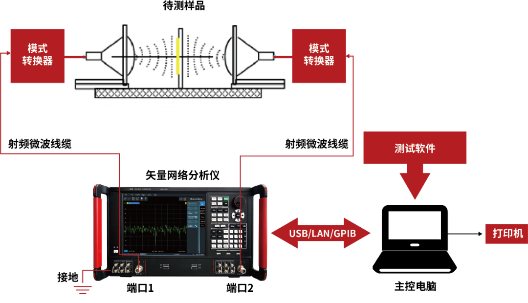 测试方法:将测试材料制作而成的待测样品均匀填充于波导、同轴线等标准传输线内,或者将待测样品制作成微带线、共面波导等微波传输线,构成一个互易双端口网络,通过矢量网络分析仪测量出该双端口网络的散射参数。根据网络参数模型即可计算出被测样品的电磁参数。