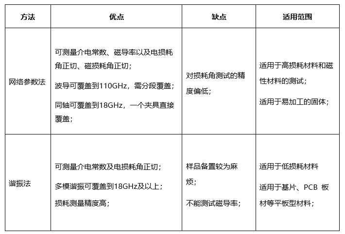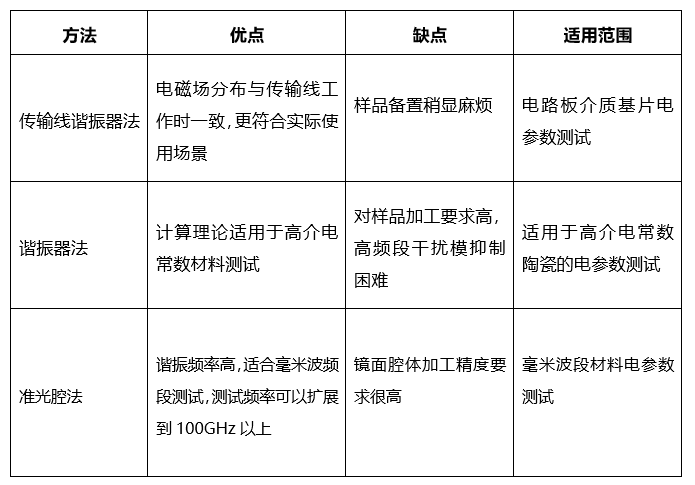目前测量介电常数常用的方法主要有网络参数法、谐振腔法、平行板电容法、同轴探头法等等。每种测试方法都有自己的适用范围,并没有一种能够适用所有场景的通用方法,因此需要根据以下特性选择合适的测试方法: