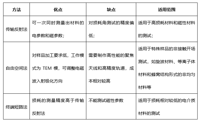 针对网络参数法和谐振腔法,又可细分为许多方法。比如从网络参数法衍生出的传输反射法、自由空间法、终端短路法;从谐振法衍生出的微扰法、谐振腔法,准光腔法等。以下对具体的测试方法和指标进行说明。