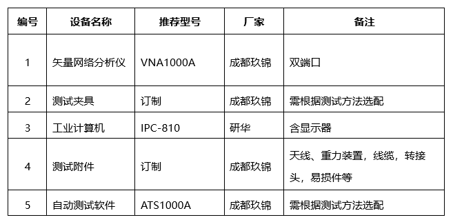 从网络参数法和谐振法的测试框图中可以看出,无论哪种测试方法,其核心都是网络分析仪。选择不同的测试方法,会有不同的夹具配置和软件配置。下面基于传输线谐振器法给出典型配置表: