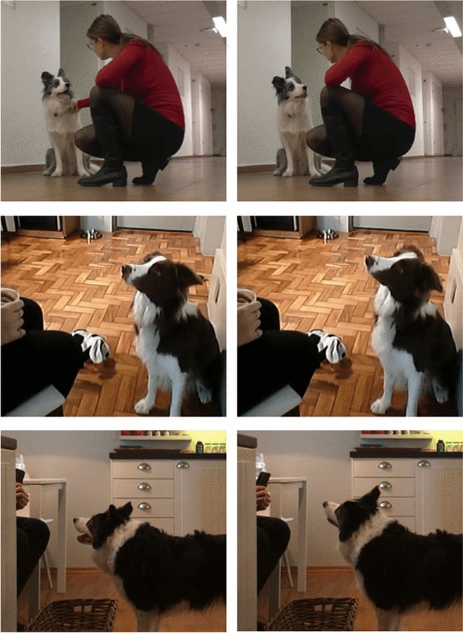 而且,小狗具备识别主人情绪的能力。一项来自日本的研究,比较了主人观看欢快的电影和悲伤的电影时身边小狗的反应,观察小狗的行为是否随着主人的情绪状态而改变。结果表明,当主人观看欢快的电影时,小狗凝视主人的时间比主人观看悲伤电影时的时间更长,也就是说,它们对主人的情绪状态很敏感[13]。